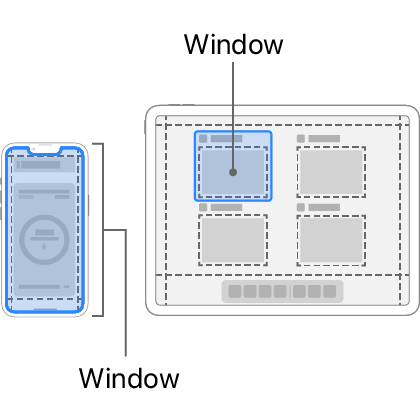 SwiftUI는 WindowGrouop 같은 원시적인 Scene을 제공한다. 시스템은 Scene의 수명주기를 관리하고, 플랫폼 및 문맥에 맞는 view 계층 보여준다. 예를 들어 iPad의 멀티 태스킹 OS는 동시에 동일한 앱의 여러 작은 인스턴스를 표시할 수 있다.