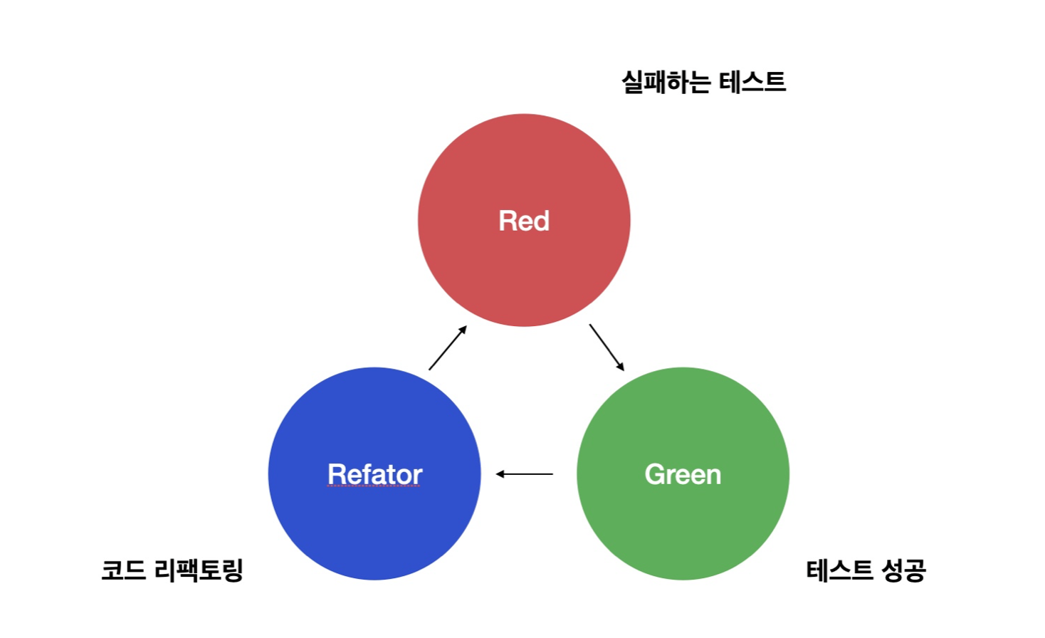 위 그림은 TDD를 가장 단순하게 표현하고 있는 그림입니다. TDD는 Red, Green, Refator 3가지 영역으로 나누어서 진행됩니다. 실패하는 테스트를 작성해보고, 이 테스트를 통과하는 코드를 만들어보고, 테스트 통과를 유지하면서 구조적으로 더 나은 코드를 연구하고 수정하는 것을 반복합니다. 그리고 이 과정을 반복하면서 더 나은 코드를 만들어나가는 것이지요.