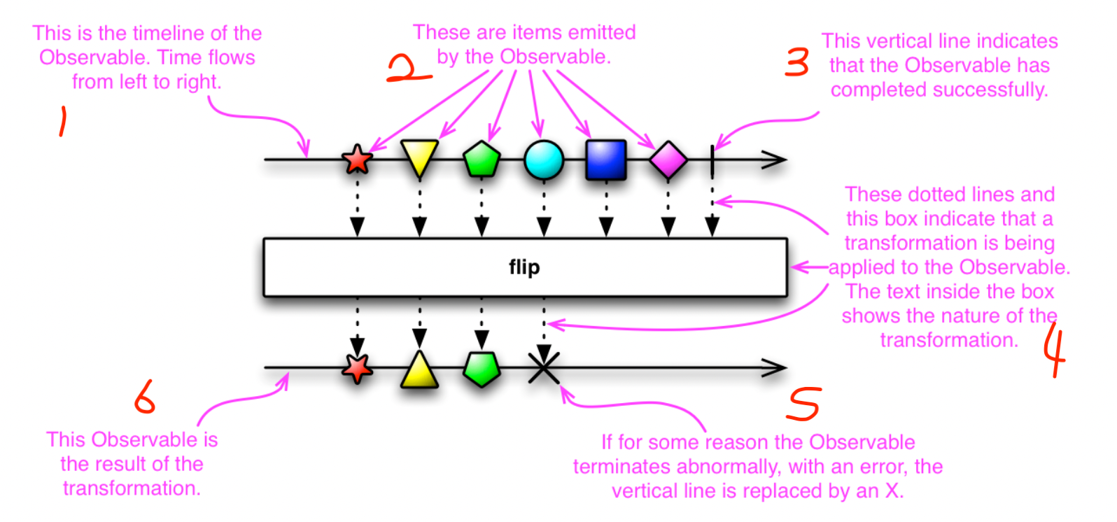 - 이 점선과 이 박스는 나타낸다. / 변환은 적용된다. / Observable 에 / 박스안에 있는 텍스트는 보여준다. / 변환의 네이처를